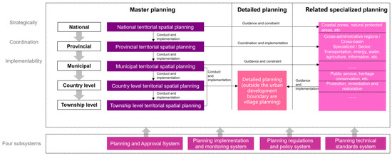 Since late 2012, China has intensified its efforts to reform and institutionalize the spatial domain. In 2013, the proposal for establishing a spatial planning system and reforming the planning system was first introduced [43]. Grounded in the reform of the ecological civilization system, the emphasis shifted toward constructing a spatial planning system centered on spatial governance and the optimization of spatial structures. This system aimed for national cohesion, connectivity, hierarchical management, and the realization of the “one plan and one blueprint for one city and county” objective [44]. This endeavor also became a pivotal means for China to resolve the conflicts arising from multiple regulations and to advance the modernization of its national governance system and capacity. Initiated with top-level design, China executed institutional reform of the planning system and established the Ministry of Natural Resources, taking the lead in instituting the territorial and spatial planning system and overseeing its implementation [45]. This initiative provided organizational context and institutional assurance for the actualization of genuine “multiple planning into one.” In 2019, China advocated the integration of spatial planning—including main functional area planning, land use planning, and urban and rural planning—into a unified territorial and spatial planning system. This highlighted that territorial and spatial planning serves as the comprehensive blueprint guiding and regulating territorial space development and utilization. Furthermore, it elucidated the overarching framework of “five levels and three categories” within territorial and spatial planning [46] (Figure 2). Within this framework, master planning encapsulates the strategic objectives formulated by local governments at all levels [47] and constitutes the cornerstone of the national territorial and spatial planning system. Detailed planning is interpreted as the implementation arrangements for specific land use, development, and construction intensity. Meanwhile, specialized planning pertains to the spatial layout for development, conservation, and utilization in specific regions and sectors to delineate specific functions [46].