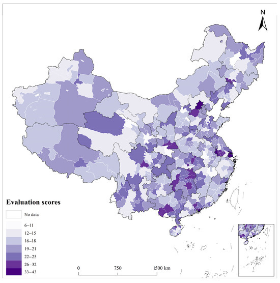 Following the adopted evaluation framework, the overall performance of territorial and spatial planning is quantified on a scale ranging from 0 to 60. This scale results from the fact that each of the 30 criteria can attain a maximum score of two, summing up to a potential total of 60 for each territorial and spatial plan. Utilizing natural breaks taxonomy for classification visualization minimizes variance within each category to emphasize intra-category similarities and maximizes variance across categories to highlight inter-category differences. Figure 4 visually represents the absence of comprehensive coverage for all criteria across territorial and spatial planning. An observation across all the assessed territorial and spatial plans reveals that merely 1.6% falls within the score range of 31 to 45, while a significant 73.4% falls between 16 and 30, and the remaining 25% score falls between 1 and 15. Descriptive statistics (Figure 4) illustrate that the total mean score for overall territorial and spatial planning performance is 18.68. The scores for individual territorial and spatial plans range from a maximum of 43 to a minimum of 6. Figure 5 displays the spatial distribution of scores for each city.