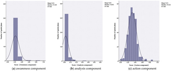 Figure 6 illustrates that merely seven territorial and spatial plans exhibit substantial awareness of climate change issues (representing over half of the total component score, approximately 1.9% of territorial and spatial planning). Furthermore, only one territorial and spatial plan includes pertinent analysis of climate change concerns. In contrast, 59 territorial and spatial plans exhibit a well-defined response to climate change issues across different Chinese cities (scoring more than half of the total component score, roughly 16.037% of territorial and spatial planning). Table 2 displays that the mean score for the awareness component was 0.21, the analysis component was 0.01, and the action component was 0.31. This indicates a notably low level of awareness and analysis concerning climate change across all territorial and spatial planning. During the assessment of territorial and spatial planning, the action component of the review framework exhibited stronger performance compared to the awareness and analysis components. Additionally, Table 3 presents the correlation among the three components and reveals a significant correlation between the analysis and action components (p < 0.01).