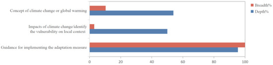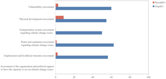 The study reveals that within the analysis component, the vast majority of territorial and spatial plans of cities fail to address vulnerability or provide assessments regarding the physical development, transportation systems, water and sanitation infrastructure, employment and livelihood structures, organizational capacities, and political support necessary for effective climate change response. Overall, nearly all public documents related to territorial and spatial planning lack a comprehensive evaluation of their planning areas. While some assessments are considered during the decision-making process, these evaluations primarily focus on the current state of territorial development and conservation, emphasizing indicators related to bottom-line control, structural efficiency, and quality of life. However, they often lack specific requirements for climate change adaptation. Figure 8 illustrates the breadth and depth scores for each criterion within the analysis section.