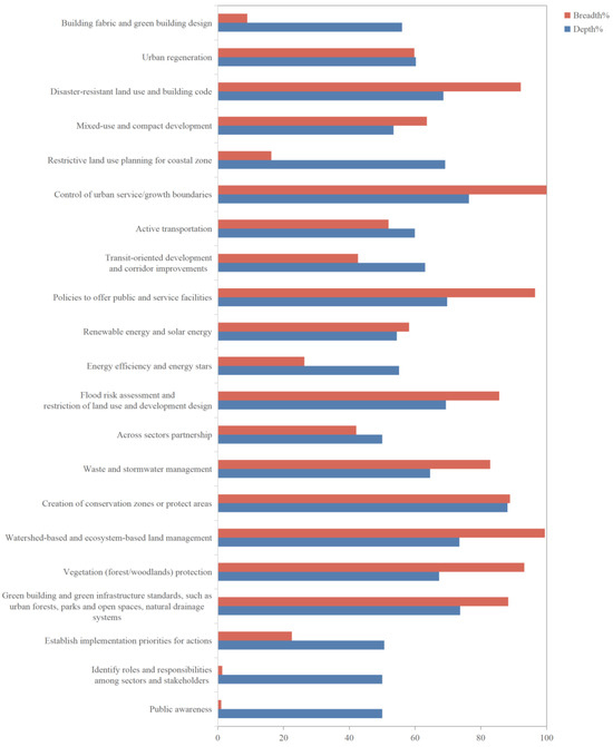 Each urban spatial plan included as an analysis sample influences the overall performance of the criteria. Notably, criteria may not exhibit uniform performance levels, and the relationship between the depth and breadth of the same criterion may display elements of randomness and probability. For instance, while cities where the same criterion is effective tend to receive higher scores, the number of cities involved may be limited, suggesting that the criterion possesses greater depth but less breadth. Analyzing breadth and depth percentage scores provides a suitable method for assessing both the relevance and extent of participation in spatial planning. This approach allows for further quantification and comparison of the overall performance differences among different criteria in spatial planning, addressing the limitations of descriptive statistical analysis in deeper data exploration and inference.