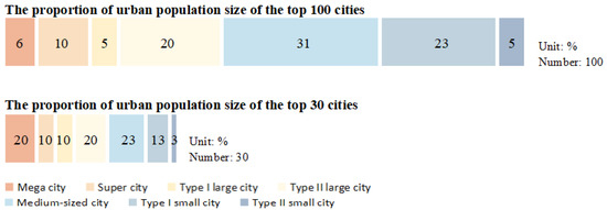 The urban population size distribution among the top 100 and 30 evaluated cities.
