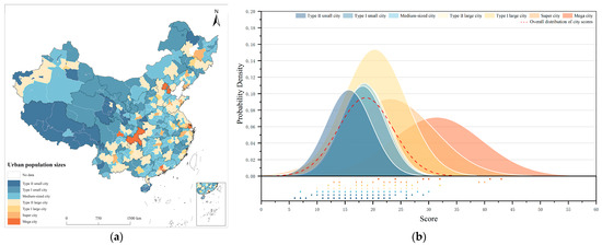 (a) Spatial distribution of urban population sizes. (b) Probability density of city scores under normal distribution stratified by urban population size classification. Correlation analysis between urban population size and city scores within each city. (Note: The population data come from the 7th National Population Census Bulletin released by the National Bureau of Statistics on 11 May 2021).