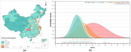 (a) Spatial distribution of urban economic aggregate. (b) Probability density of city scores under normal distribution stratified by urban economic aggregate classification. Correlation analysis between urban economic aggregate and city scores within each city.