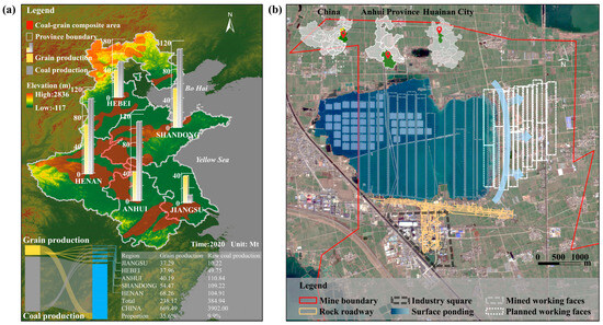 In the CGCA of China, encompassing provinces such as Jiangsu, Anhui, Shandong, Henan, and Hebei, these issues are particularly prominent [24]. This region boasts abundant coal resources and has a long history of agricultural production, with vast expanses of arable land. In 2020, coal and grain production accounted for 9.9% and 35.6% of the country’s total output (Figure 2a), respectively, thereby making significant contributions to ensuring national energy security, food security, and rapid societal development. Regions characterized by HGT are susceptible to water accumulation on the surface due to mining subsidence, which can destroy substantial areas of arable land.