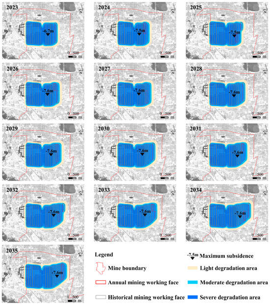 Figure 4. Spatio-temporal evolution of mining subsidence and surface ponding from 2023 to 2035.