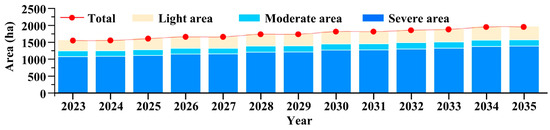 The area statistics of land damage zoning from 2023 to 2035 are shown in Figure 5. After the first stage of mining, the surface began to sink. Based on the existing subsidence water area, it expanded eastward with the new subsidence caused by the mining area of the working face. At that time, the total subsidence area of the surface affected by coal mining reached 1577 ha, of which the light damage area was 334 ha, the moderate damage area was 160 ha, and the heavy damage area was 1083 ha. The area of perennial and seasonal water accumulation accounts for 79% of the total subsidence area, which means that this part of the land is transformed from high-quality farmland to a water accumulation area.