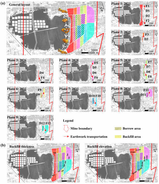 Figure 6. Phased Reclamation Planning: (a) Phased earthwork allocation scheme; (b) Filling thickness and elevation of backfill area.