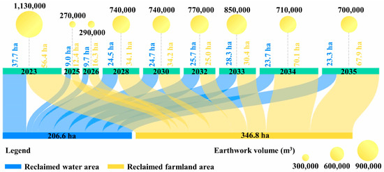 Taking the first phase of reclamation as an example, the total area of soil excavation for this phase is 37.7 ha, with an available soil quantity of 1,130,000 m3 and a backfilling area of 56.4 ha. Upon the completion of the reclamation, the total area of soil excavation will be 206.6 ha, with a total soil quantity in construction of 6,200,000 m3, corresponding to a total backfilling area of 346.8 ha.