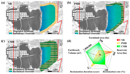 Figure 8. Land use change in the study area under different development scenarios: (a) NR; (b) PMR; (c) CMR; (d) Comparison of reclamation efficiency.