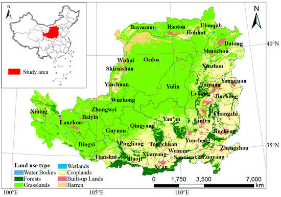 The Loess Plateau is the most concentrated and largest loess accumulation area in the world, with an area of about 640,000 square kilometers. It is one of the areas with the most concentrated contradiction between population, resources, and ecological environment in China. The Loess Plateau is a semi-humid and semi-arid region with diverse vegetation types and the largest proportion of grassland area, with an average altitude of 500–2000 m. The region spans seven provinces (autonomous regions), including Henan, Qinghai, Ningxia, Gansu, Shaanxi, Shanxi, and Inner Mongolia. Since the reform and opening-up, the continuous increase of population in the Loess Plateau has stressed the sustainability of regional resources and environment along with the rapid industrialization and urbanization development. Presently, the sustainable development of the Loess Plateau has been restricted by such problems as sparse vegetation, serious soil erosion, high population pressure, lagging industrial development, and landslide disasters. The geographical location of the Loess Plateau in China is shown in Figure 1.