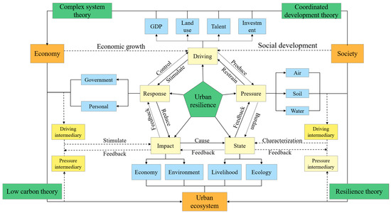 Urban resilience is a new concept in sustainable urban planning, where cities and local governments need to enhance their ability to reduce losses and shorten recovery periods from any potential disaster [8]. Due to the ecological environmental deterioration and urban livable threats brought about by rapid industrialization and urbanization, how to assess urban resilience and identify driving factors have become the key issues to sustainable urban planning and design in the future [9]. Presently, existing studies have emphasized that the assessment of urban resilience should not only consider the dynamic changes in the social economy and urban ecosystem, but also pay attention to the inter-relationship between various subsystems of urban resilience [10,11]. The theoretical framework exploration of urban resilience mainly includes the PSR (pressure-state-response) framework [12], the DPSEEA (driving-pressure-state-exposure-effect-action) framework [13], the UGS-3CC (urban green space-concepts and competences and connections) framework [14], and the DPSIR (driving-pressure-state-impact-response) framework [15]; these frameworks are widely used to investigate the dynamic relationship between regional socio-economic systems and the ecosystem.