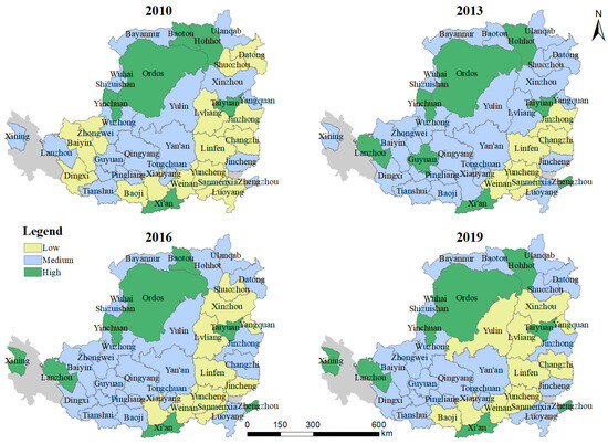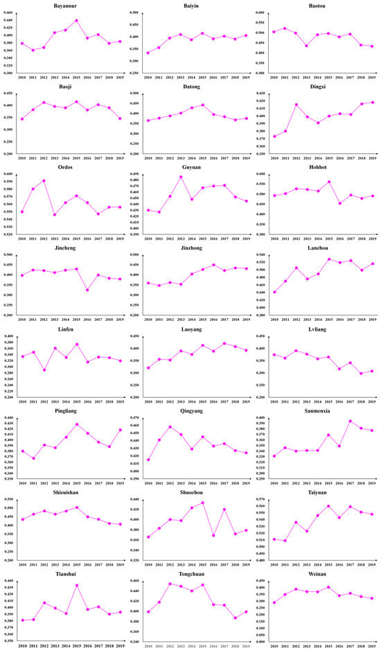 Regarding the measurement results of the urban resilience of the Loess Plateau from 2010 to 2019 (Table 3), it could be concluded that most cities have low level and medium levels of urban resilience, indicating that the urban resilience of the Loess Plateau is not ideal. Six cities had an average higher than 0.5, including Ordos (0.562), Hohhot (0.504), Taiyuan (0.539), Xi’an (0.536), Yinchuan (0.521), and Zhengzhou (0.502), with a proportion of 15.38%. The reason for the high-level urban resilience is that these cities are regional economic centers or resource-based cities, with relatively developed socioeconomic levels, and the government has a high ability to manage the ecological environment and improve the carrying capacity of urban ecosystems. In terms of temporal evolution characteristics, the urban resilience of most regions showed a trend of fluctuation evolution, and some cities presented a declining trend from 2010 to 2019. Twelve cities presented an increasing trend of urban resilience from 2010 to 2019, including Baiyin, Dingxi, Jinzhong, Lanzhou, Luoyang, Sanmenxia, Taiyuan, Wuhai, Xi’an, Xining, Zhengzhou, and Zhongwei, with a proportion of 30.77%.