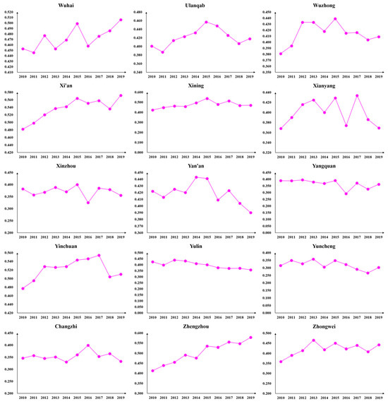 From the perspective of a single city (Figure 3), Xi’an and Zhengzhou showed a significant growth trend from 2010 to 2019; the urban resilience of Xi’an increased from 0.482 in 2010 to 0.572 in 2019, with a growth rate of 18.67%. The urban resilience of Zhengzhou increased from 0.413 in 2010 to 0.578 in 2019, with a growth rate of 39.95%. Lvliang and Yulin presented a significant decline trend in urban resilience from 2010 to 2019; the measurement results of urban resilience in Lvliang decreased from 0.375 in 2010 to 0.349 in 2019, with a reduction rate of 17.87%. The urban resilience of Yulin decreased from 0.425 in 2010 to 0.398 in 2019, with a reduction rate of 15.76%. Regarding the temporal trends of urban resilience in single city, twelve cities showed a declining trend of urban resilience from 2010 to 2019, indicating these cities have insufficient capital and technology investment in urban disaster management and ecological governance and protection. In addition, twelve cities showed a growth rate of more than 10%, with a proportion of 30.77%, including Baiyin (21.56%), Dingxi (12.06%), Jinzhong (20.06%), Lanzhou (17.01%), Luoyang (22.43%), Sanmenxia (13.90%), Weinan (11.07%), Wuhai (11.70%), Xi’an (18.67%), Xining (11.35%), Zhengzhou (39.95%), and Zhongwei (23.12%).