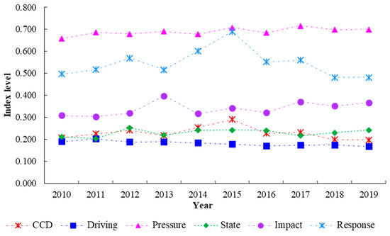 Figure 5. Evolution characteristics of CCD and five subsystems from 2010 to 2019.