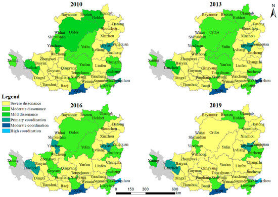 Regarding the spatial variation of CCD on the Loess Plateau from 2010 to 2019, it could be found that the coupling coordination degree showed a significant imbalance in spatial difference, and the overall spatial characteristics are characterized by “central depression” with the temporal evolution (Figure 6). Indicating that there is an unbalanced development problem among the driving, pressure, state, impact, and response subsystem of urban resilience in the central region of the Loess Plateau, the possible reason is that some cities pay more attention to economic development while neglecting ecological environment protection and pollution control. The increase in the number of severe dissonance cities indicates that ecological protection and disaster prevention and control in the Loess Plateau region still needs to be improved, and that some cities still face tremendous pressure to cope with ecological and environmental protection and disaster prevention and mitigation.