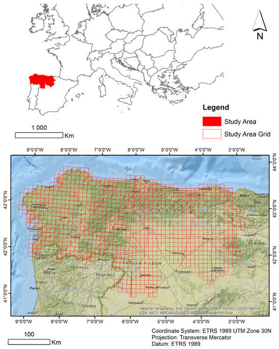 The study area of this work encompasses the surrounding administrative divisions of the Cantabrian mountain range, namely: the autonomous community of Galicia, the principalities of Asturias and Cantabria, and the provinces of León, Palencia, Burgos, and Zamora in the Castilla y León community. The study included a total of 1107 UTM grids of 10 × 10 km (Figure 1). The Cantabrian Mountains and its surroundings are in a transitional zone between the Mediterranean and temperate climates and are essential for conserving plant diversity on the Iberian Peninsula [25]. They are one of the three mountain regions with the highest plant richness in the Iberian Peninsula [61]. Its floristic diversity has a high degree of endemicity [62] and approximately 10% of this is considered taxa of special interest by its endemicity and singularity, with more than 300 taxa in this situation [63]. Specifically, in the regions of Galicia, Asturias, and Cantabria live 2391 [64], 2163 [65], and 2631 [66] taxa. Although there is no published catalog for the community of Castilla y León, there are estimated to be more than 3000 taxa collected in different databases [67]. These numbers illustrate the richness of the flora in these communities. Regarding protection, the Galician species list encompasses 77 vascular plants, including fern taxa, 26 bryophytes, 5 algae, and 4 lichens. Notably, this is the only catalog encompassing non-vascular plants among other taxonomic groups [68]. The protection lists of different regions vary in their inclusion of vascular plants. Asturias includes 65 taxa [69], Cantabria has 27 [70], and Castilla y León lists 314 [58,71], each with distinct categories.