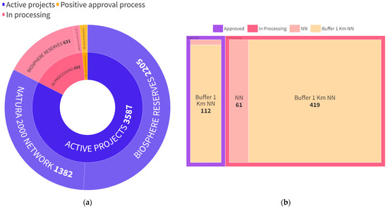 (a) Number of wind turbines active, approved and in processing within the Natura 2000 network. Interactive graphic available at the following link: https://public.flourish.studio/visualisation/15268736/ (accessed on 12 September 2020) (b) Number of wind turbines approved and in processing in the Natura 2000 network (NN) and in a buffer of 1 km. Interactive graphic available at the following link: https://public.flourish.studio/visualisation/15268670/ (accessed on 12 September 2020).