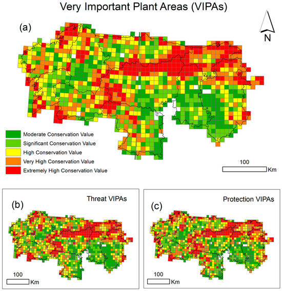 (a) Very important plant areas (VIPAs) calculated using maximum threat and protection values for vascular plants, bryophytes, and habitats, along with rarity and endemicity parameters. (b) VIPAs calculated using threat values for vascular plants, bryophytes, and habitats, along with rarity and endemicity parameters. (c) VIPAs determined exclusively based on the protection values of vascular plants, bryophytes, and habitats.