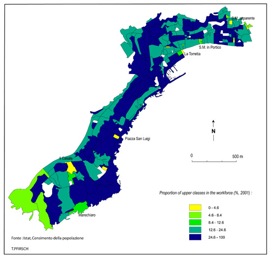 20]). Within these districts, the upper classes were clearly overrepresented: in Posillipo, they accounted for 25% of the working population—three times the municipal average (