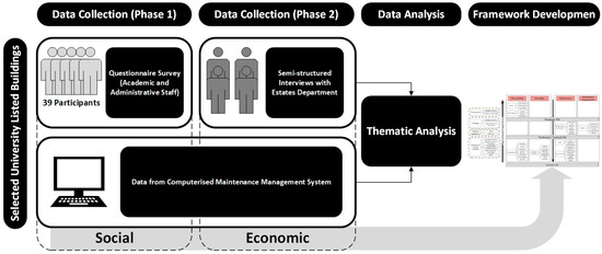 This research aims to explore effective FM strategies for the occupation of listed buildings following their adaption for reuse to achieve socioeconomic value and reduce environmental impacts. For the nature of this research, a case study of a listed building that is adapted and currently in use as a university building was used to contextualise the findings and support providing a more informative outcome (Figure 1). In that regard, this study adopted an inductive approach where reasoning is connected to an individual context in which knowledge or events take place, moving from the specific and observable phenomena out to the generalisable [43,44]. Due to the intricate nature of the research problem, a mixed-methods approach using a sequential data collection strategy was adopted. This research employed mixed method research (MMR) to provide a more nuanced approach to exposing socioeconomic value within the scope of listed buildings [45]. The research uses convergent MMR to allow triangulation of the results and enhance a better understanding of the research problem being investigated [46]. By utilising convergent MMR, the impact of listed buildings on socioeconomic value, as well as the role FM strategies play in this field, is being explored. The primary data collection was carried out in two phases: the quantitative phase and the qualitative phase.