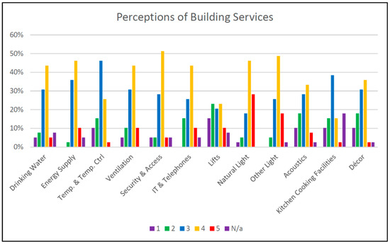 The questionnaire survey explored users’ satisfaction, perceptions of building services, perceptions of the ‘Accessibility, Suitability, and Usability’ of the access and movement and toilet facilities and sought their commentary on any problems experienced, adaptions observed, and changes they might recommend. The results showed that most building users (67%) felt the buildings were sufficient for their needs. Equally, most building users felt that building access and toilette facilities were suitable and usable. However, almost half of the respondents felt the accessibility of the buildings could be better. Thematic analysis of the qualitative data from the questionnaire survey gave more insight into user perceptions of operational issues in the buildings, revealing two general dimensions: building use and user experience. Specifically, building use describes users’ spatial interactions with the building and relates to building accessibility, acoustics, and space management themes. The users felt that the buildings’ layout limits access to and through the buildings, noting that this could prove problematic for those with mobility issues, whilst adding how the attempts to improve access by adding a small lift were less-than-ideal due to its positioning. Users’ responses suggest that whilst recognising spatial improvement attempts with the addition of flexible furniture, improved windows, and attempts to divide the spaces, they still felt that the spaces were awkward, with limited access to sockets, and were less than ideal for some teaching approaches. Figure 2, for instance, illustrates the perceptions of users on different building services. In essence, these perceptions show that the users’ evaluation of building services is generally satisfactory, but issues were faced in some aspects, including temperature, lifts, kitchen facilities, IT, and ventilation.