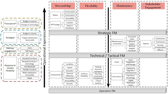 To explore effective strategies for facility management in historic buildings, this study utilised a university and two of its HBs as a case study. Users of those HBs were surveyed, CMMS data from those buildings were analysed, and members of the FM team were interviewed to give a multifaceted and detailed perspective of operating in an HB. Interview and survey data were thematically analysed to identify themes pertinent to the participants’ experiences of operating in an HB and to garner their views on approaches necessary for the continued operational delivery of university services in that context. Key findings from that analysis are presented in a framework (Figure 3) utilising the concept of organisational management levels comprising strategic, tactical, and operational for the results’ meaning to be understood more widely. The key findings based on that framework are as follows: