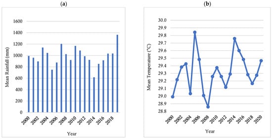 The northern part of Ghana is administratively divided into the Upper West, Upper East, Northeast, Northern, and Savannah regions. These regions experience above-average mean temperatures, which usually reach 29 °C or more in the dry season, compared to 25–26 °C in the southern regions [54,55,56,57]. The average precipitation rate in the north is often less than 1000 mm, while it is 1200 mm in the south and can even reach up to 1500 mm in the far southeast. This study was conducted in the Kassena Nankana Municipality in the Upper East region of Ghana, where mean annual rainfall over the past few decades has been sporadic, with frequent surges and relapses (see Figure 1a). One of the highest mean annual rainfalls occurred in 2007 (1203.8 mm); this followed periods of lower rainfall from 2000 to 2006. However, in the subsequent years, the mean rainfall decreased, reaching as low as 617.3 mm in 2014, before increasing again up to 1363.4 mm in 2019. The mean annual temperature of the Municipality also increased by 0.5 °C over the past two decades, from 29 °C in 2000 to 29.5 °C in 2020. However, this increase has also been characterized by significant fluctuations (see Figure 1b). In 2005, the mean temperature increased sporadically by 0.8 °C relative to the record in 2000 and remained high until 2008, when the mean temperature dropped by 0.1 °C below the record in 2000. The mean temperature has since risen, reaching as high as 29.8 °C and 29.5 °C in 2014 and 2020, respectively.