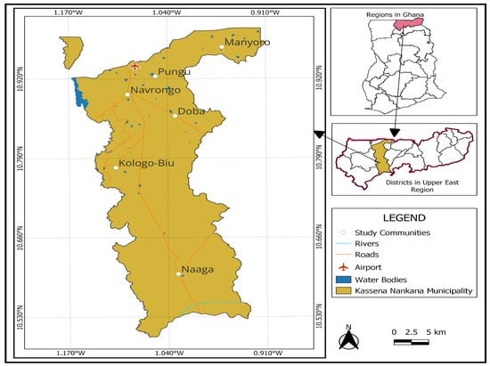 The data for this research were collected over six months from January to June 2021. The Kassena Nankana Municipality comprises six major communities/townships representing the zonal divisions for local government administration: Navrongo, Doba, Manyoro, Pungu, Kologo, and Naaga (see Figure 2). A multi-stage stratified purposive sampling procedure was used to select two villages from the six communities to be representative of the whole municipality. The villages were selected based on four main criteria: (1) exposure to climate extremes; (2) food insecurity; (3) accessibility for data collection; and (4) willingness to participate.