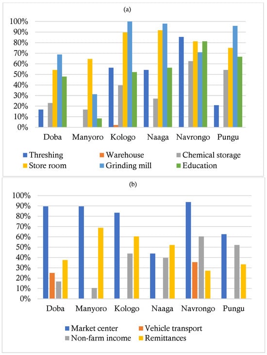(a) Percentage of households with access to assets for food processing and storage activities across the study communities; (b) percentage of households with access to assets for food marketing activities across the study communities.