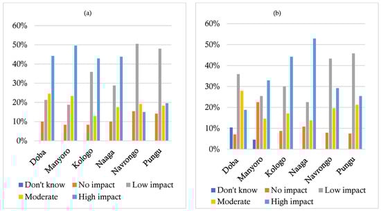 Figure 5a shows that many households in Manyoro (49.6%), Doba (44.2%), Naaga (43.8%), and Kologo (42.9%) reported high impacts of climate hazards on food crop processing and storage. The high impacts in these communities can be attributed to the very limited access of households to proper threshing and storage services (as was shown earlier in Figure 4a). At one of the focus group discussions, a participant discussed how challenges limiting access to threshers and harvesters lead to high climate impacts, explaining that: