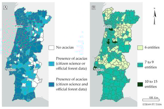 Municipalities with the presence of acacia, according to one source (citizen science or official forest data, light blue) or two sources (citizen science and official forest data, dark blue) (A), and the number of entities (institutions the respondents belong to) developing acacia control methods, by municipality, according to our survey results (B). A municipality is the second-level administrative subdivision of Portugal, and there are currently 278 units in mainland Portugal.