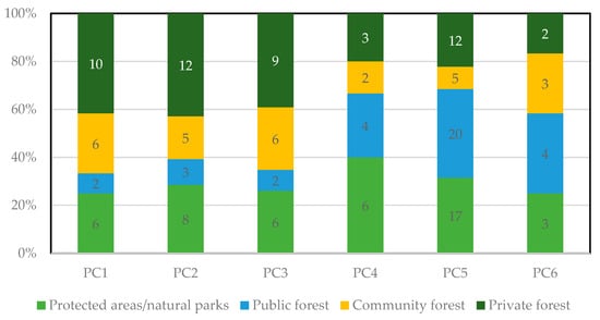 Acacia control measures were applied to different types of forests and protected areas/natural parks (Figure 2). As expected, each PC worked on their land or where they were responsible for the management. PC3 (Forestry enterprise technicians and/or managers) intervenes in all forest tenures with a smaller presence in public forests. PC6 (scientists/researchers) has more work developed in public forests, likely because of the respective research activities.
