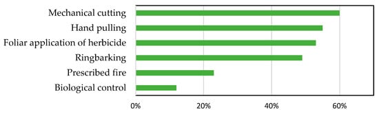 Regarding the methods known or applied by the respondents to control these invaders, mechanical cutting seems to be the most chosen, followed very closely by other mechanical methods (Figure 4). Among the respondents, 96% selected one mechanical method, and 72% selected the combination of one mechanical and one chemical method. Among the respondents, 23% and 13% selected prescribed fire and biological controls, respectively.