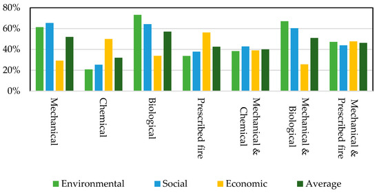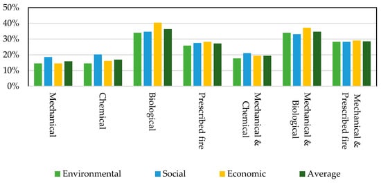 Giving the same weight to each sustainability component (environmental, social, and economic) and calculating the average, the most sustainable method is the biological control, followed by mechanical control and the combination of mechanical and biological control (Figure 6). In most cases, when the percentages are high for the environmental and social components, the economic component receives lower values. The opposite trend was also observed. This result must be carefully analyzed since, although the most sustainable method seems to be biological control, it was also the one with the most lack of answers and the least known and/or applied by the respondents (Figure 4). During this sustainability assessment, the greatest divergence in opinions regarding the method’s sustainability was observed in the case of chemical control (p-value < 0.05; F = 3.9). This statistical difference is mainly due to the position of the two groups: PC1 (forest owners, community forest managers), which, in most cases, considers chemical control to be sustainable, and PC6 (scientists/researchers), which assesses it with low scores due to its cost and environmental impact.
