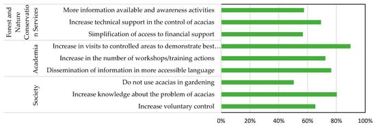 Controlling IASs is a task in which complementarity is required between specific actors and society. Focusing on the Forest and Nature Conservation Services, Academia, and the general public, we assessed how their complementarity may improve acacia control processes (Figure 8). According to respondents, more than 60% considered that the Forest and Nature Conservation Services should increase technical support from their experts and provide more information and available funding for acacia control measures in the coming years. More than 70% of the respondents considered that Academia should increase the number of workshops and training events, promote the demonstrations of best practices, and disseminate the information created during their research in a more accessible language. Finally, more than 60% of respondents considered it important to increase society’s knowledge of the acacia control problem and their will to contribute to controlling invaded areas in the coming years, given the high percentage of private forest areas in Portugal and the high costs involved.
