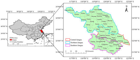 Jiangsu is located in the eastern coastal region of China, the lower reaches of the Yangtze River and the Huai River, and is an important part of the Yangtze River Delta region, which is located in the warm temperate zone and subtropical climate junction area, with mild climate, abundant light and heat, abundant water resources, and flat terrain. The plain area accounts for 86.89% of the whole province. Jiangsu is one of the important grain-producing provinces and regions in China. In 2021, the GDP reached 11.6 trillion yuan, ranking second in the country, and 25 counties in the province are ranked among the top 100 counties in China, making it one of the most economically prosperous provinces in China. In recent years, the imbalance of economic development in this region has become increasingly prominent, and the spatial heterogeneity is increasingly obvious. A series of problems, such as urban diseases, declining resource carrying capacity, and decreasing species diversity, arising from urban expansion, reduction of arable land, and environmental damage, are becoming more and more prominent [55]. In the context of territorial spatial planning, how to coordinate the development of PLEF has become an urgent problem to be solved.