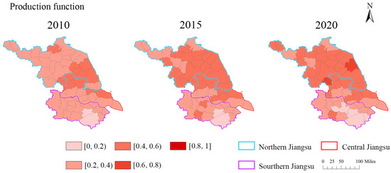 In terms of the spatial pattern, the production function showed an overall distribution pattern of being high in central Jiangsu and being low in the north and south. In 2010, Suzhou and Wuxi in the Taihu Lake basin were at the lowest values of production function, which was less than 0.2. The coastal county of Rudong was at the maximum value of the production function at 0.475. In 2015, nearly half of the districts had production function values between 0.4 and 0.6, and Jinhu had the highest production function value at that time of 0.529. However, the production function values of Suzhou and Wuxi were still lower than 0.2 and showed a further decreasing trend. By 2020, the overall layout of the production function in Jiangsu had changed little. The production functions of Jinhu and Sheyang steadily improved to above 0.6, but the production function of Kunshan and Changzhou, which are close to Suzhou and Wuxi, fell below 0.2.