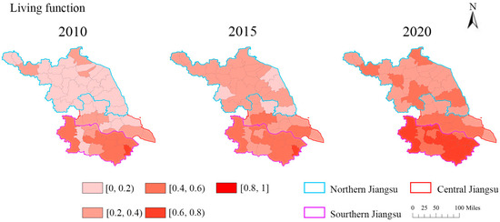 In terms of the spatial distribution, the distribution of living function showed a decreasing pattern from south to north, with significant regional differences. The score of living function in the southern part of Jiangsu is much higher than that in the northern part, which showed a similar distribution pattern with the level of socioeconomic development. In 2010, almost all of the living function values in northern and central Jiangsu were below 0.2, with the lowest in Dongtai at only 0.056. At this time, in nearly half of southern Jiangsu, the values of the living function were more than 0.4, and sometimes considerably more, as in the case of Kunshan reaching 0.738, which was 13 times that of Dongtai. The average living function was just 0.231 in 2010. In 2015, almost all regions had improved their living functions to above 0.2, with only four counties—Binhai, Sheyang, Dongtai, and Sihong—still below 0.2. Despite this, only one-third of the counties in Jiangsu reached 0.4 or more, and Kunshan was still the only area with a living function of 0.6 or higher. However, the difference between the highest and lowest values was only 4 times. At this point, the provincial average of the living function rose 1.5 times to 0.335. By 2020, there had been a significant improvement in the whole province. All areas with the living function below 0.2 had disappeared. The number of districts with the living function of 0.4 or more reached 29, while the number of districts with the living function of 0.6 or more reached 10. The gap between the maximum and minimum values narrowed further, with a difference of only 3-fold.