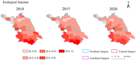In terms of the spatial distribution, the ecological function scores were similar to the living function scores, with an overall decreasing distribution pattern from south to north. In 2010, the vast majority of areas had ecological function scores between 0.2–0.4 and 0.4–0.6. There were eight areas with ecological function scores greater than 0.6, two of which were above 0.8. The maximum value was 0.848 for Yixing, and the minimum value was 0.086 for Guanyun. There was a 10-fold difference between them. In 2015, Pizhou, which used to have an ecological function value below 0.2, was ranked above 0.2 for the first time, while Peixian, Guanyun, Suining, and Shuyang were still below 0.2. Meanwhile, the ecological function value of Rudong, which used to be above 0.6, unexpectedly dropped to 0.381. The provincial minimum improved from 0.086 to 0.136, but the average dropped from 0.417 to 0.394. By 2020, Guanyun, in the low-value area, removed the below 0.2 ranks, but Liyang, Xuyi, and Jurong, in the high-value area, dumped the above 0.6 ranks. In addition, the maximum value also decreased from 0.847 to 0.784. The average recovered from 0.394 in 2015 to 0.407 in 2020, but it was still less than the value of 0.417 at the beginning of the study period. Looking at it from a comprehensive point of view, the high-value areas were mainly located in the Taihu Lake basin, which was attributed to the dense water network and the abundance of wetlands in the area. The low-value areas were mainly concentrated in the northwestern counties, where there were many reclaimed mines and greater environmental pollution [56]. The temporal trends showed little overall change in the ecological function scores, with the mean values fluctuating between 0.39 and 0.41.