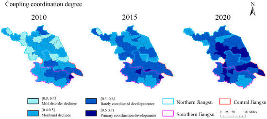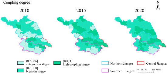 According to CCDM, the coupling degrees of 53 districts in Jiangsu in 2010, 2015, and 2020 were measured, respectively. The measured values were spatially linked with the spatial analysis units in vector format via ArcGIS 10.6 software to form the spatial distribution of the coupling degree of the PLEF in Jiangsu in 2010, 2015, and 2020, as shown in Figure 6.