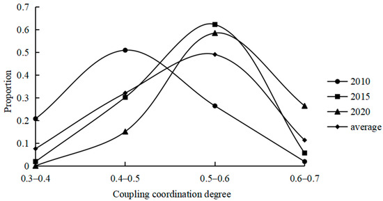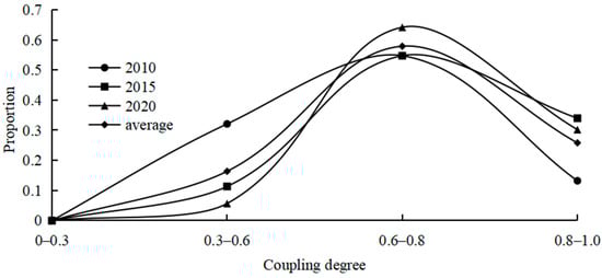 By means of frequency analysis, the proportion of each coupling type in the same time period was calculated in groups according to the criteria of classifying coupling types, and the evolution curves of the coupling degree of the PLEF in 2010, 2015, and 2020 were fitted, respectively, as shown in the Figure 7.