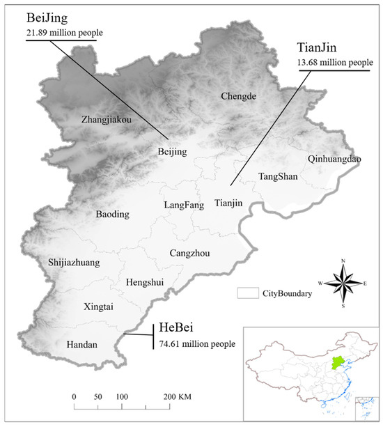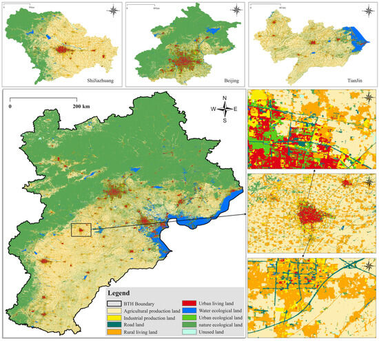 The Beijing–Tianjin–Hebei city cluster(Figure 1) located at latitude 37°27′~42°40′ N and longitude 113°27′~119°50′ E, is situated in the area north of the lower reaches of the Yellow River in northern China, east of the Bohai Sea, including the 2 municipalities directly under the central government of Beijing and Tianjin, and 11 prefecture-level cities such as Shijiazhuang and Tangshan in Hebei province, with a land area of approximately 180,000 km2, accounting for 3.8% of the total urban land area of the country. BTH is situated within the temperate continental monsoon climate zone, with high topography in the northwest and low topography in the southeast; the arable land is generally devoted to dryland farming. The BTH region, which has a high population density, a long history of agriculture, and rapid industrial development, is the largest urban agglomeration in the Bohai Sea region of Northeast Asia, and it is the largest and most dynamic economic zone in northern China. Separately, Beijing is the economic, political, and cultural center of China, with an important development status, and is a city of significant status in China. Tianjin is located in the center of the Bohai Sea region, and has a port known as “the largest port in northern China”. Tianjin is also the economic hinterland of the Beijing–Tianjin–Hebei region, with a vast land area, abundant natural resources, and developed high-tech industries, which has enormous potential for development. Hebei province, located in the heart of the Bohai Sea region, contains 11 prefecture-level cities. It has tremendous development advantages in terms of natural resources, distribution, production, markets, talents, and location, making it one of the fastest-growing economic regions in China. In recent years, Beijing and Tianjin, as the central growth points of the region, have stimulated the integrated development of sub-cities in the region, enabling the BTH to achieve a regional GDP of RMB 9.6 trillion in 2021 [36,37]. However, the siphoning effect of large cities has led to unbalanced development within the BTH, exhibiting polarization; rapid urbanization and industrialization have led to ecological degradation, reductions in arable land area, traffic congestion, and deterioration of the population’s living environment, which affects sustainable economic and social development [38]. The rapid development of non-agriculturalization in rural areas of the BTH region has been attributed to the advancement of urbanization and industrialization. This has also resulted in a strong transition of rural production spaces and living spaces towards urban production and living spaces, causing certain encroachment and damage to ecological spaces in the process. However, research on the distribution and evolution of land-use functions in the BTH from a PLES perspective is relatively scattered. Therefore, this study selected the BTH region as the study area to investigate the functional utilization of land use at different scales, which has typical significance.