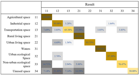 In Plan C, both night-time light features and POI density were added, which could effectively distinguish urban central areas from non-urban areas (urban central areas generally exhibit a high economic activity density, numerous POIs, and high night-time light brightness, while suburbs are the opposite). This led to an overall accuracy increase of 6.33% and a Kappa coefficient increase of 7.24, greatly improving the model’s ability to distinguish between urban and agricultural living spaces, urban green spaces, and non-urban ecological green spaces. The confusion matrix of the validation set for Plan C is shown in Figure 3, which indicates that the overall performance of the algorithm and dataset is good, but errors still occur in distinguishing between roads and agricultural living land and between agricultural production space and non-urban green space. To some extent, the shape features obtained from object-oriented segmentation and the socio-economic features provided by night-time light and POI density data help to solve the problems of “same object, different spectrum” and “same spectrum, different object” (which is more typical in function-type classification) and can significantly improve the accuracy of the spatial classification of PLES based on functionality.
