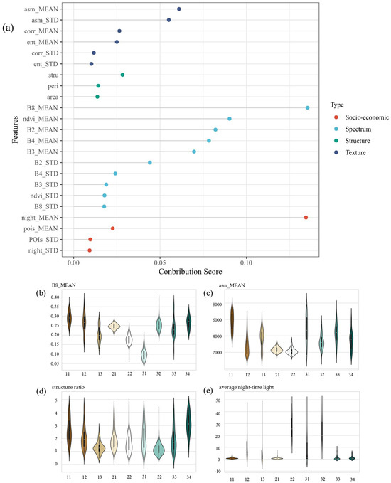 To specifically explore the discriminative effect of different features on PLES categories, the feature values of typical four categories were computed (as shown in Figure 4b–d): the average red band value of each object (B8_MEAN refers to the mean of the red band values of all image elements of an object, which is a typical representative of spectral features); the average value of the angle second-order moment band (asm_MEAN is the mean of angular second-order moments of all image elements of an object, which is a typical representative of texture features); the structure ratio (the more prominent shape feature); and the average night-time light brightness (the more prominent socio-economic feature) of each object. These four categories represent spectral, textural, shape, and socioeconomic features, respectively. Different land covers have different observable reflectance values in the red band, with vegetation exhibiting the highest values, followed by buildings and water bodies. The red band also aids in distinguishing different types of built-up areas; the red band reflectance in agricultural residential spaces is generally higher than in urban residential spaces. The structural complexity of land objects helps to differentiate land classes from a different perspective. For instance, urban green spaces and non-urban green spaces have similar surface-cover characteristics, making it difficult to distinguish them based on spectral and texture features alone. However, due to human development activities, such as roads and buildings, urban green spaces exhibit a higher fragmentation and tend to have more irregular shapes. In contrast, non-urban green spaces are less affected by human activities, resulting in more regular shapes. Therefore, the structural complexity of non-urban green spaces far exceeds that of other land classes. The night-time light brightness of land patches greatly contributes to distinguishing rural residential areas from urban residential areas. As depicted in Figure 4, roads, factories, and water bodies are widely distributed, exhibiting significant variations in night-time light brightness. Conversely, urban areas have a high population density and more nocturnal production and living activities, leading to a higher night-time light brightness. In contrast, cropland and rural residential areas have lower night-time light brightness values, making it easier to differentiate between urban and rural areas.
