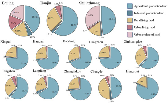The spatial distribution patterns and proportions of human-induced PLES land use (refers to the land that mainly performs the function of serving for human activities, including agricultural space, industrial space, transportation space, rural living space, urban living space, urban ecological space) in Beijing, Tianjin, and other cities in Hebei province are significantly different. Figure 6 depicts the proportion of land-cover types under artificial utilization in various cities within the Beijing–Tianjin–Hebei region. Urban areas in Beijing and Tianjin, as megacities each with a population of over 10 million, occupy 43.67% of the urban living space within the entire urban agglomeration. The urban living space in Beijing and Tianjin is huge and concentrated, and there are extensive urban green spaces distributed throughout the city, including the central area, accounting for 17.76% and 7.95% of the urban land use, respectively. Industrial production spaces are distributed in the peripheral areas further away from the city center, indicating a high level of coordination in the PLES. In contrast, cities in the rest of Hebei are much less developed than Beijing and Tianjin, and land development and utilization are dominated by agricultural production spaces, covering approximately 6.72 million hectares of arable land in 2021, accounting for 90.17% of the arable land area of the entire BTH region and 27.17% of the total land area. In Hebei province, construction land is mainly devoted to enhancing rural living spaces, and the urban living space is relatively small in patches. The proportion of urban ecological land area is only 0.73%, and a large amount of industrial land is distributed on the edge of urban living space or even in the core area, resulting in more obvious conflicts in PLES. In general, the land in the study area is covered by natural vegetation, with non-urban ecological land and unused land accounting for 54.77% of the total area. Artificially utilized land is used for production spaces, especially for agricultural production space, accounting for 59.43% of the total area of artificially transformed land. Industrial production space and rural living space are scattered, while urban living space is mainly concentrated around several large cities. At the micro level, rural living space in plain areas is generally surrounded by agricultural production space, and a proportion of rural living areas has industrial production space distributed internally or on the periphery. Industrial production land is generally located on the outskirts of cities, but in some less developed cities in Hebei, such as Baoding, industrial production space surrounds the main urban area; there are also scattered industrial production spaces within the rural living space. Urban living space in the main urban area and some suburban centers outside the main urban area is continually expanding, gradually replacing the original “agricultural production space–rural living space” system with an “industrial production space–urban living space” system.