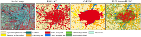 Many scientific research teams [43,44,45,46] have been engaged in large-scale land-use classification, striving to improve the precision and accuracy of classification through finer granularity, and they have achieved meaningful results. A set of high-precision, high-availability land-use products have been produced and shared on open platforms for use by other scholars. Researchers in planning, environmental, and other fields have relied on these public data for a series of secondary classifications, exploring and summarizing the regional development laws. However, traditional large-scale land-use classification data divide the land surface into categories such as forests, cultivated land, and buildings based on the natural attributes of land cover. They do not specifically distinguish categories within buildings, which is completely inadequate for assessing the population’s living environment and the sustainable development of cities, or typical regions undergoing rapid industrialization and urbanization. Therefore, this study has proposed a production–living–ecological classification system which includes nine secondary classifications, such as agricultural production space and industrial production space. Based on the functionality of land use, the classification results can facilitate fine-grained land-use analysis, providing reliable data support for the analysis of PLES in city clusters and typical regions and the sustainable development of city clusters. Figure 7 illustrates a comparison between the land-use product of the European Space Agency (ESA LUCC) [43], the land-use product of the Resource and Environmental Science Data Center of the Chinese Academy of Sciences (CNLUCC) [44], and our PLES classification product (functional PLES LUCC). As shown in Figure 7, the ESA LUCC focuses on the natural attributes of ground attachments and does not consider the fine-scale classification of different buildings. Therefore, it is not suitable for the secondary analysis of functional land use, such as production–living–ecological functions. Although the CNLUCC can distinguish between urban construction land and rural construction land, the product resolution is 30 m, which results in relatively fuzzy boundaries between different functional land parcels and prominent misclassification phenomena. In contrast, the functional PLES LUCC developed in this study has a spatial resolution of 10 m and, with the assistance of multi-source data, can differentiate between different functional types such as rural living space and urban living space. Therefore, the PLES classification dataset developed in this study has a high practicality in studies of regional development pattern evolution. And the multi-scale classification algorithm of the PLES space function in this article is applicable to both rural and urban land-use classification, taking into account both natural and artificial land-use functional characteristics. It has a wide application scope and high practical value. It needs to be emphasized in particular that, as mentioned in the introduction, the same piece of land may carry production, living, and ecological functions, and our classification system and resulting dataset focuses on identifying their dominant functions.