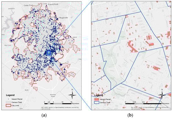 (a) Study area (Austin, TX); (b) Inset map showing the vacant parcels within census tracts.