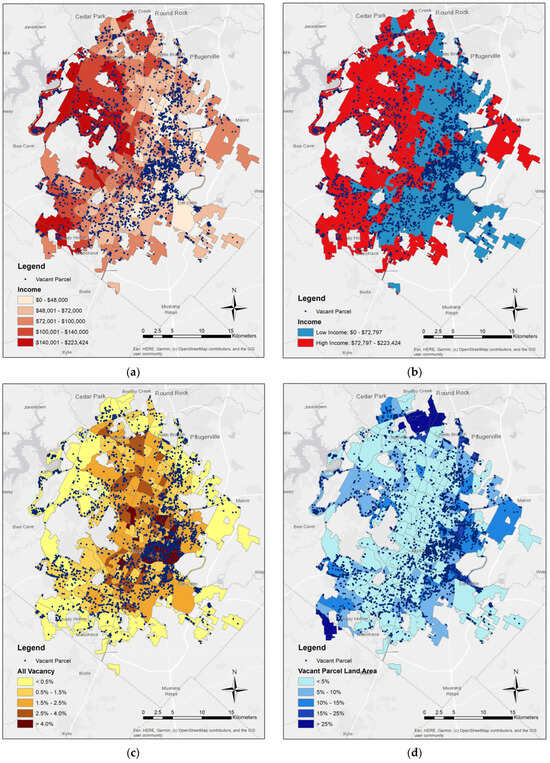 Spatial distributions of urban vacant parcels and income levels. (a) All income; (b) Low and high income; (c) All vacancy; (d) Vacant parcel land area.