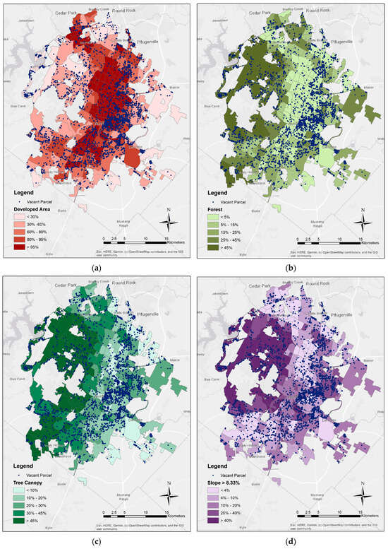 In Austin, while urban vacancies measured with vacant addresses showed a lower level of green infrastructure, it is noteworthy that vacant land areas measured with vacant parcels showed a different pattern. Specifically, areas with more forest and herbaceous land covers tended to show a higher level of vacant land areas. Vacant land was also more prevalent in areas already covered in greenery but not associated with a tree canopy or rich vegetation. These findings can suggest that these vacant properties in Austin have been serving as ecological assets and green infrastructure. Several studies showed that vacant land that has a great quality of green infrastructure (i.e., number of trees, tree size, and tree species composition) can contribute to reducing air pollution and carbon dioxide [,], ameliorating urban heat island effects [,], and increasing habitat connectivity []. Furthermore, vacant land, if managed correctly as green infrastructure, can contribute to flood resilience by managing stormwater runoff in the community []. Thus, more consideration for repurposing vacant land with green infrastructure rather than chasing potential investment is necessary to contribute to both ecological and economic benefits.